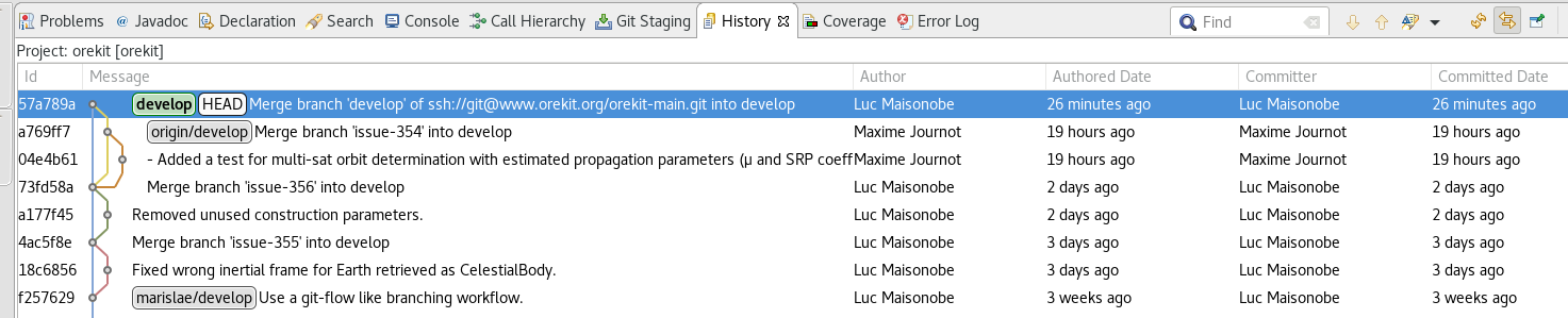 orekit.org).Then I created a local branch fixing issue 356, 2 days ago (commit a177f45), merged it to my local develop branch (which with --no-ff created a merge commit 73fd58a), and pushed my local