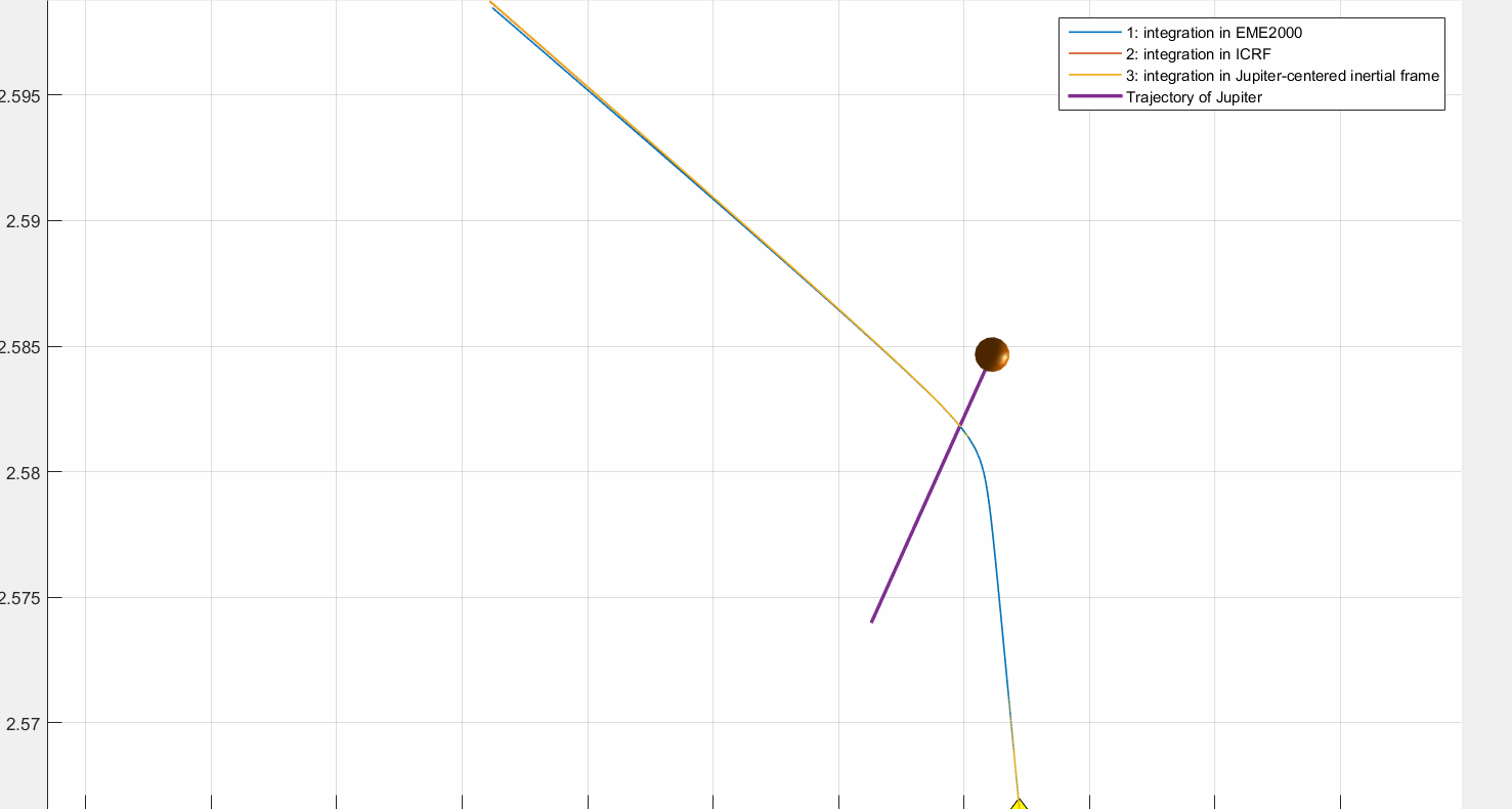 - swing-by about Jupiter in different reference frames (EME2000, ICRF, inertial centred on Jupiter),