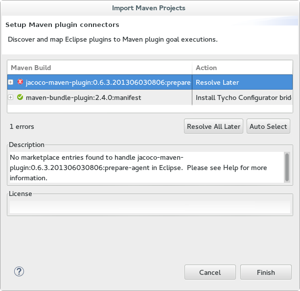 I have recently started having problems importing Orekit projects into eclipse using the "Import..." "Existing Maven Projcts" option under the File menu. It turns out something is going wrong with the Tycho Project Configurator. The first time you import a project in a blank Eclipse it has to go download that plugin. It then fails with an error at the end of the building process, which is after the project is finished loading. The next time through it fails at the beginning, so the whole thing is short circuited, the project isn't properly built and the whole thing comes crashing down.
