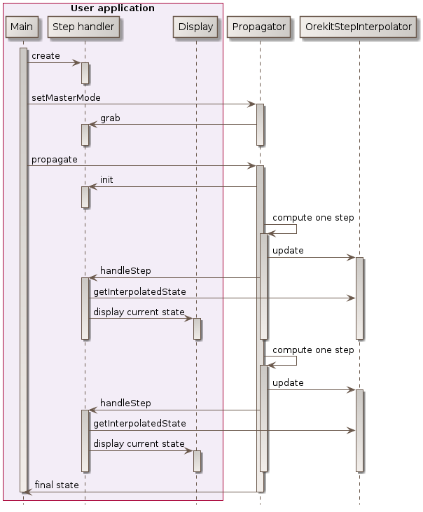 This mode also lets the propagator choose its own step size, but still let user choose a different step size for its output, which greatly increases performances. The following sequence diagram shows how a user-provided step handler is called when propagation is done in master mode.