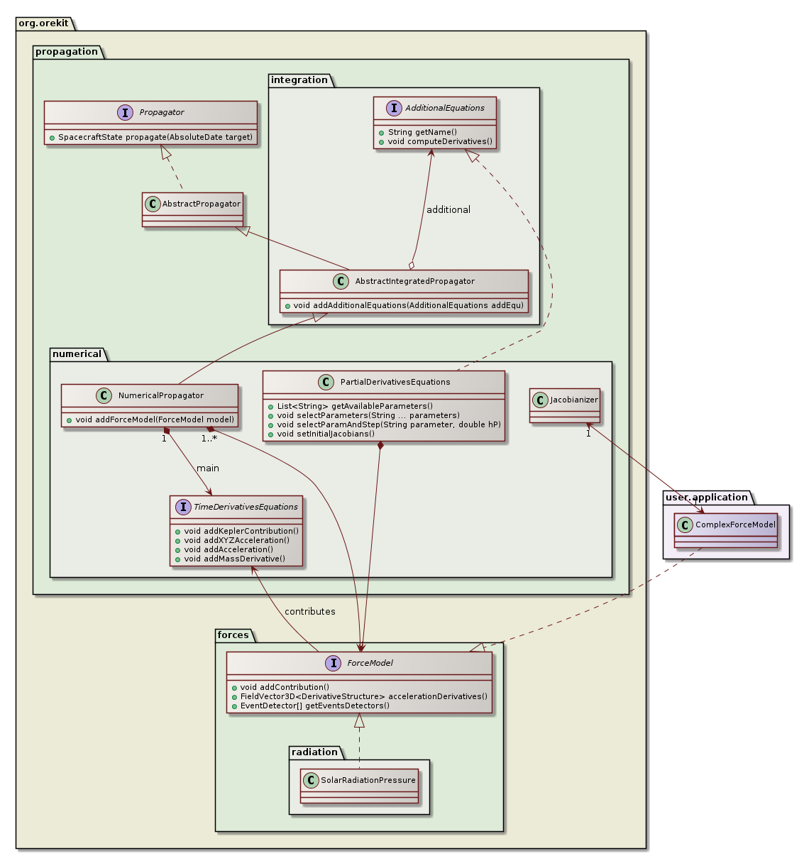 The above class diagram shows the design of the partial derivatives equations. As can be seen, the PartialDerivativesEquations class implements the AdditionalEquations interface and as such can be registered by user in a numerical propagator. the propagator will propagate both the main set of equations corresponding to the equations of motion and the additional set corresponding to the Jacobians of the main set. This additional set is therefore tightly linked to the main set and in particular depends on the selected force models. The various force models add their direct contribution directly to the main set, just as in simple propagation. They also add a contribution to the Jacobians thanks to the AccelerationJacobiansProvider interface, each force model being associated with an acceleration Jacobians provider. Some force models like solar radiation pressure implement this interface by themselves. Some more complex force model do not implement the interface and will be automatically wrapped inside a Jacobianizer class which will use finite differences to compute the local Jacobians.