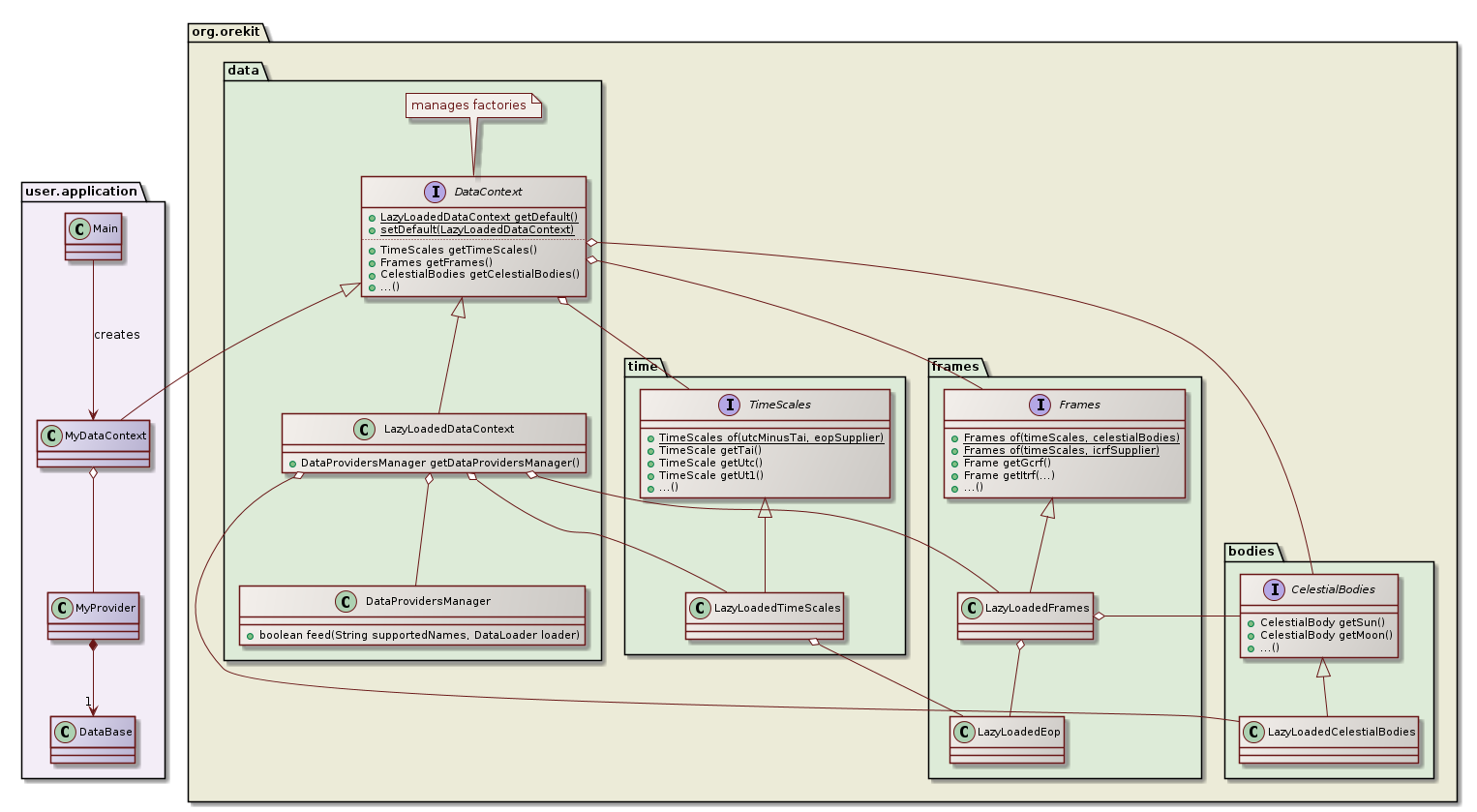 The top level interface is DataContext. It gathers links to all the factories Orekit uses to create the physical models that themselves require loading data. There is one factory for TimeScales that will need UTC-TAI history data for creating the UTC time scale, and EOP data for creating the UT1 time scale. There is one factory for frames that will need EOP data for Earth frame. There is one factory for celestial bodies that will need planetary ephemerides data for all bodies.