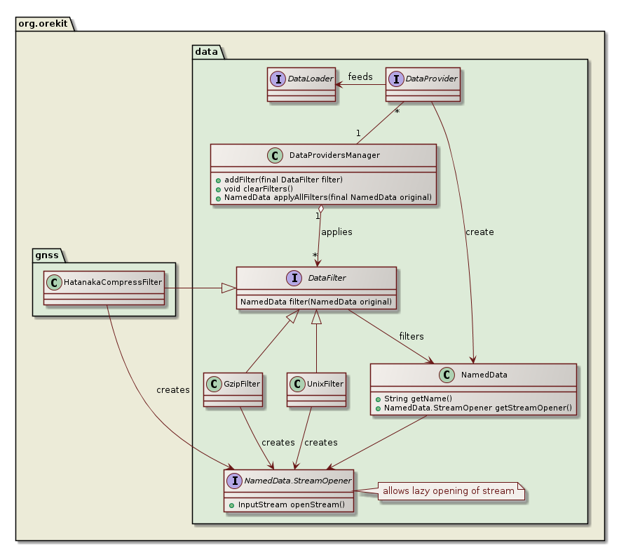 The filtering architecture is based on a stack of NamedData instances, with at the bottom an instance created by a DataProvider that will read bytes directly from storage, then some instances added by the DataProvidersManager.applyAllFilters method, each one reading bytes from the underlying stack element and providing filtered bytes to the next element upward. If at the end the name part of the NamedData matches the name that the DataLoader instance expects, then the byte stream of the top of the stack is opened. This is were the lazy opening occurs, and it generally ends up with all the intermediate bytes streams being opened as well. The opened stream is then passed to the DataLoader to be parsed. If on the other hand the name part of the NamedData does not match the name that the DataLoader instance expects, then the full stack is discarded and the next resource/file from the DataProvider is considered for filtering and loading.