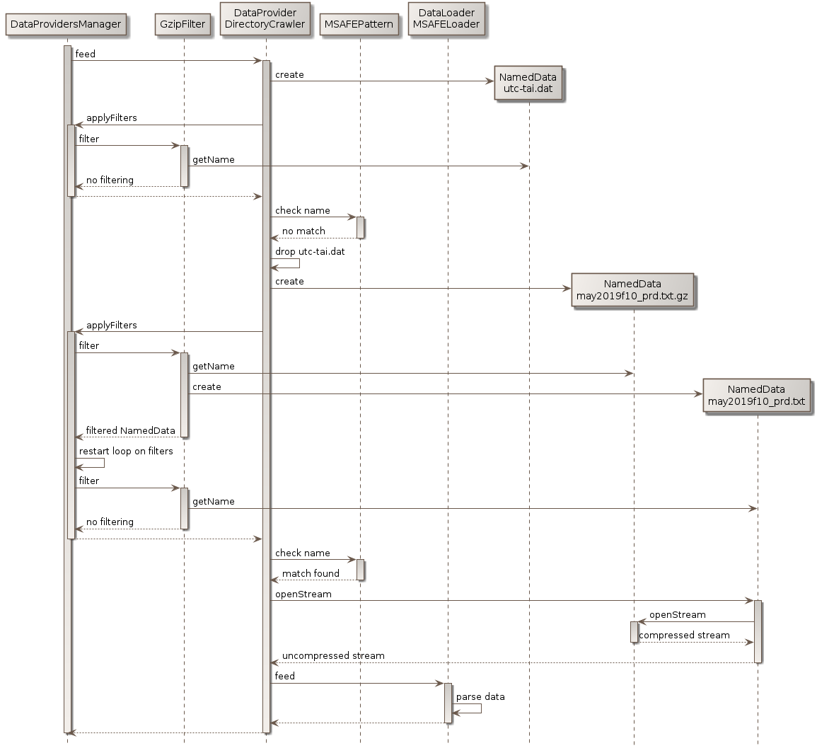 The DirectoryCrawler then considers the next directory, and in this directory the next file which is may2019f10_prd.txt.gz. A new NamedData is created for it and the filters are checked. As the extension is .gz, the GzipFilter filter considers it can act on the file and it create and returns a new NamedData, with name set to may2019f10_prd.txt and lazy stream opener set to insert an uncompressing algorithm between the raw file bytes stream and the uncompressed bytes stream it will provide. The loop is restarted, but no other filter applies so at the end the stack contains two NamedData, the bottom one reading from storage and providing gzip compressed data, and the top one reading the gzip compressed data, uncompressing it and providing uncompressed data. As the name of the top instance matches the expected pattern for MSAFE data, the MarshallSolarActivityFutureEstimation will be able to load it. At this stage, the DirectoryCrawler calls the method to open the bytes stream at the top level of the stack. This method then asks the underlying NamedData to open its stream (which it the raw file data), feeds the gzip uncompression algorithm with this data and provides the output uncompressed data as a newly opened bytes stream. The data loader then parses the data, without knowing that is is uncompressed on the fly.