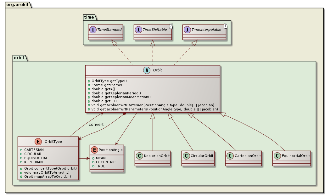 From the early design, the various orbit classes retained only the kinematical notions at a single time. They basically represent the current state, and serve as data holders. Most of the methods provided by these orbits classes are getters. Some of them (the non-ambiguous ones that must be always available) are defined in the top Orbit abstract class (Orbit.getA(), Orbit.getDate(), Orbit.getPVCoordinates()). The more specific ones depending on the type of representation are only defined in the corresponding class (CircularOrbit.getCircularEx() for example).