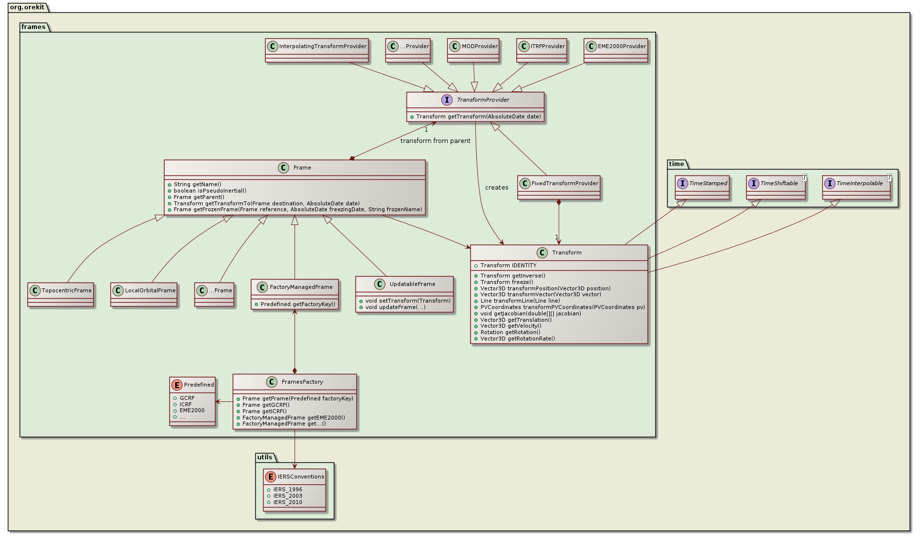 The org.orekit.frames package provides classes to handle frames and transforms between them.