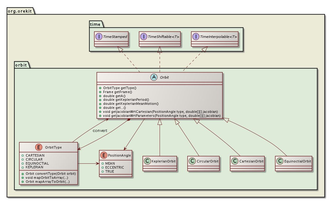 This package is the basis for all of the other space mechanics tools. It provides an abstract class, Orbit, extended in four different ways corresponding to the different possible representations of orbital parameters. Since version 3.0, keplerian, circular, equinoctial and cartesian representations are supported.