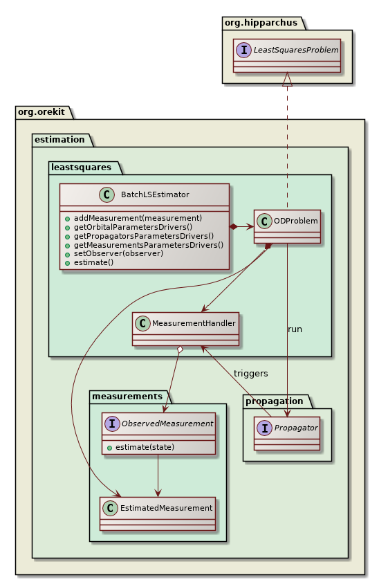 The BatchLSEstimator class creates an internal implementation of Hipparchus LeastSquaresProblem interface to represent the orbit determination problem and passes it to one of the LeastSquaresOptimizer implementations to solve it. Several choices are possible, among which LevenbergMarquardtOptimizer and GaussNewtonOptimizer. The former is considered more robust and can start from initial guesses farther than the second one. If GaussNewtonOptimizer is neverthelesss selected, it should be configured to use QR decomposition rather than LU decomposition for increased stability in case of poor observability. During the resolution, the selected Hipparchus algorithm will call the evaluate method of the local LeastSquaresProblem model at each algorithm test point. This will trigger one orbit propagation with some test values for the orbit state and the parameters (for example biases from the measurements modifiers parameters or drag coefficients from the force models parameters). During the propagation, the Orekit step handler mechanism is used to collect the state and its Jacobians at measurements dates. A MeasurementHandler class performs the binding between the generic step handling mechanism and the orbit determination framework. At each measurement date, it gets the state and Jacobians from the propagator side, calls the measurement methods to get the residuals and the partial derivatives on the measurements side, and fetches the least squares estimator with the combined values, to be provided back to the Hipparchus least squares solver, thus closing the loop.