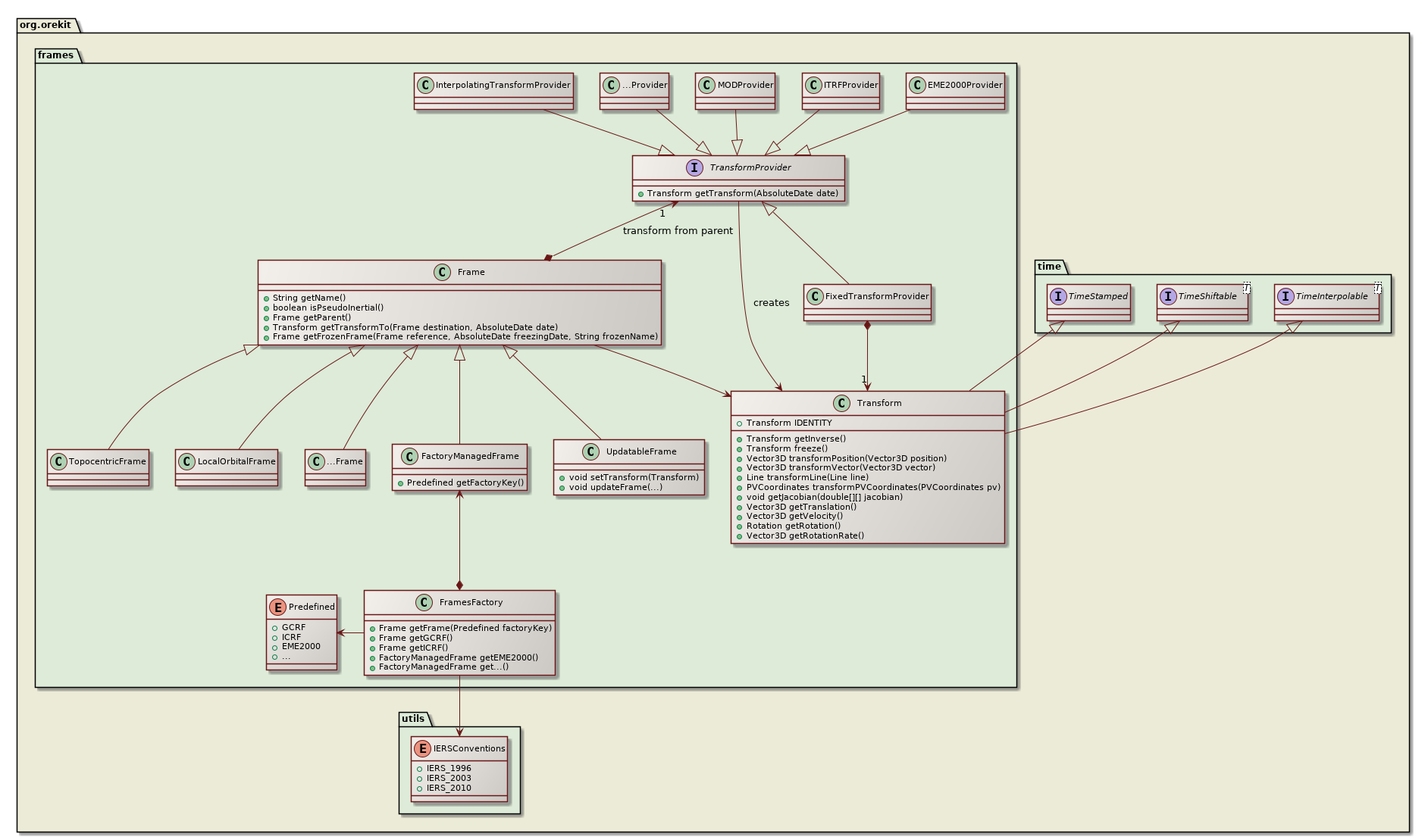 The org.orekit.frames package provides classes to handle frames and transforms between them.
