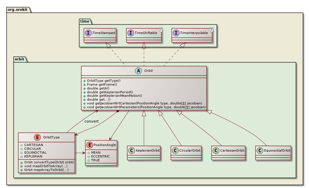 This package is the basis for all of the other space mechanics tools. It provides an abstract class, Orbit, extended in four different ways corresponding to the different possible representations of orbital parameters. Since version 3.0, Keplerian, circular, equinoctial and Cartesian representations are supported.