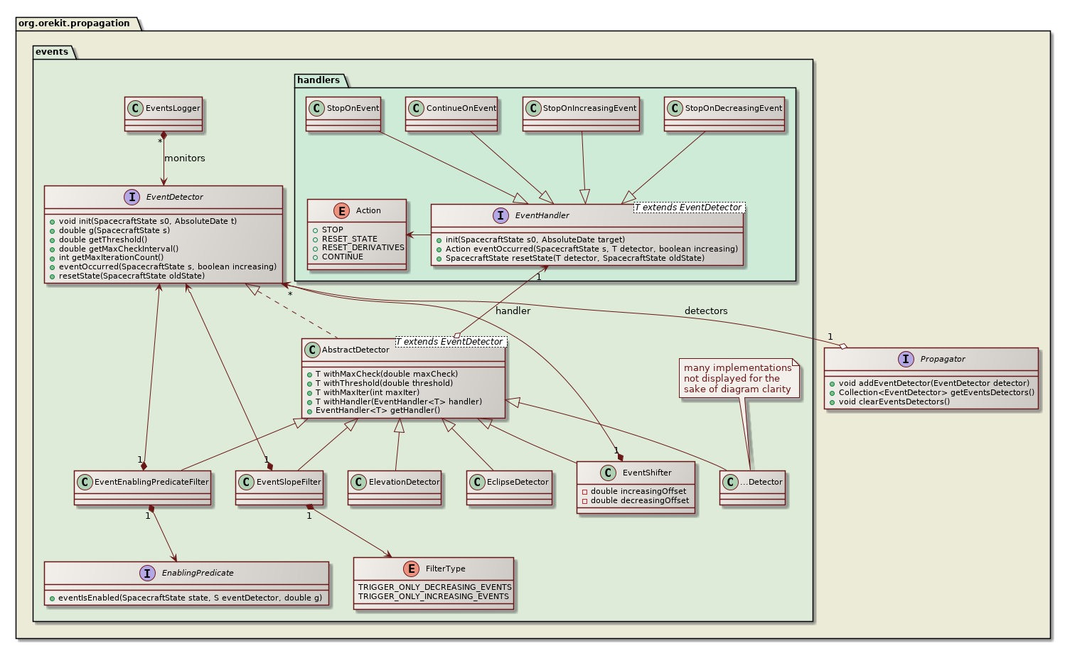 All propagators, including analytical ones, support discrete events handling during propagation. This feature is activated by registering events detectors as defined by the EventDetector interface to the propagator, each EventDetector being associated with an EventHandler that will be triggered automatically at event occurrence. The following class diagram shows the main interfaces used for event handling.