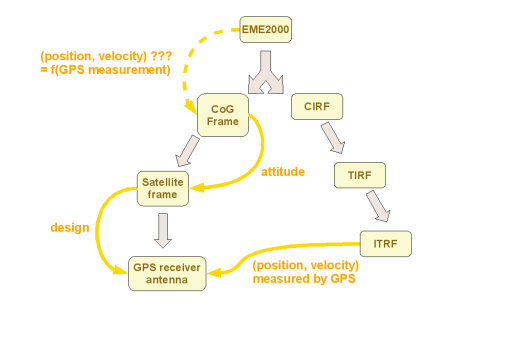 The CoG frame has its origin at the satellite center of gravity and is aligned with EME2000. It is linked to its parent EME2000 frame by an a priori unknown transform which depends on the current position and velocity. This transform is what we want to compute.
