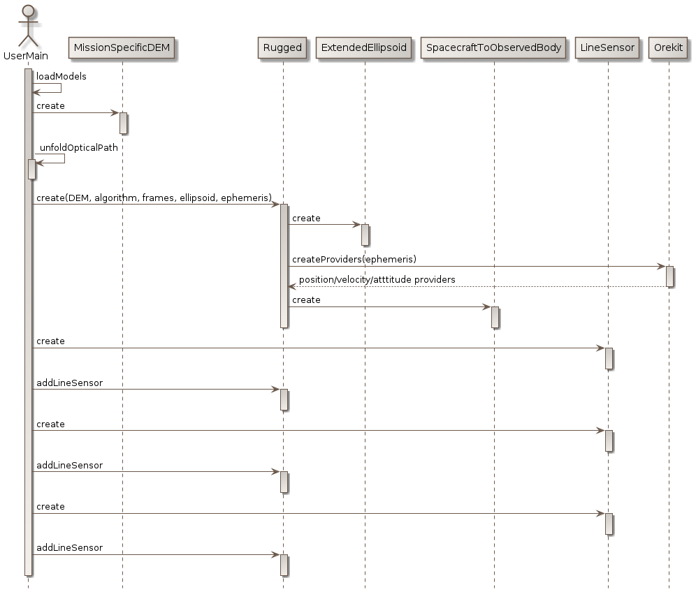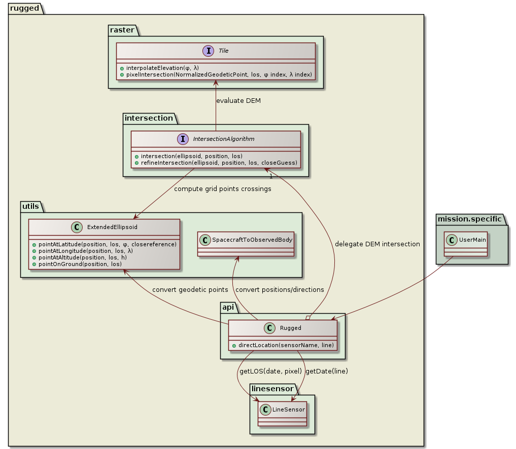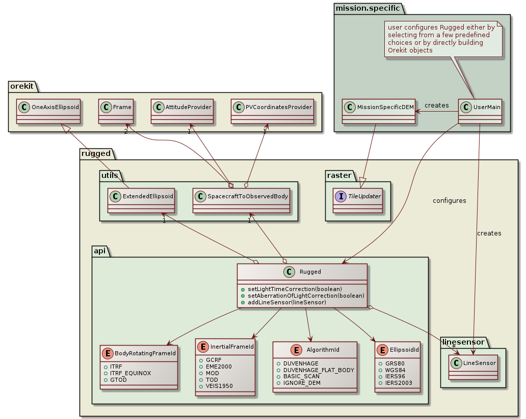 The user of the Rugged library is responsible to provide its main program and a mission specific Digital Elevation Model loader, in the form of a class implementing Rugged TileUpdater interface. He also creates a LineSensor containing the geometry of the pixels line-of-sights. He then creates an instance of the top-level Rugged class and provides it the created objects as well as its selection of options for algorithm, ellipsoid and frame choices.
