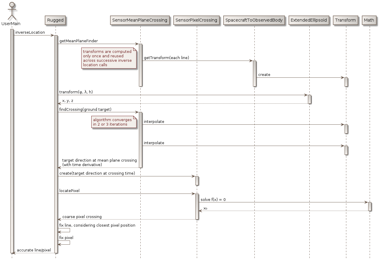Inverse location is called a large number of times by the application, typically on a regular grid in some geographic reference like UTM. The application only provides image processing related data, i.e. the geodetic coordinates of the ground points and expects the coordinates of the corresponding pixel (both line number of pixel number). The pixels independent computation (orbit and attitude interpolation, Earth frame to inertial frame transforms, transforms composition) are performed only once per line and cached across successive calls to inverse location, thus greatly improving performances.