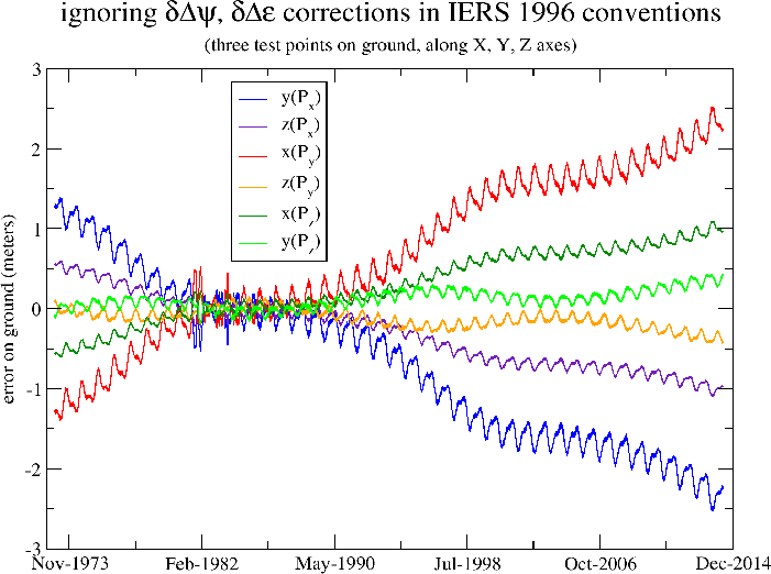 The following figure is a plot of this error, showing the coordinates of three Earth points along the three canonical X, Y and Z axes, roughly at Earth radius. The plot shows a clear regular signal with several harmonics, which correspond to the nutation components that were not in this older model. This error was small in the 80's but is much higher now (as of 2014, it is of the order of magnitude of 3 meters). The error is steadily increasing.